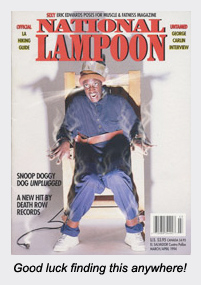 One contact we made at the convention that year was an editor at National Lampoon Magazine, who encouraged us to send in a comedy submission. That we did, and in the March/April 94 issue of National Lampoon, Joe Comics made his grand debut to the world, or maybe more accurately, to the 47 people who still read National Lampoon Magazine at the time. Joe's was a six page story featuring our hero fighting against Trend, a send up of the squinty-eyed, high-waisted, boxing-helmeted, shoulder-padded, wrist-banded, pony-tailed super hero that was dominating the industry at the time. We hadn't spent time fleshing out the Joe Comics Universe at this point, but we did know that Joe was a hero without powers who weilded crazy looking weapons, and who's best pal was a lop-eared cartoon rabbit named Clumpy. Unfortunately for us, National Lampoon Magazine went out of business shortly after Joe's appearance, and we swear it had nothing to do with our story.