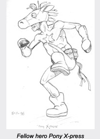 In addition to Clumpy, the Joe Comics Universe was now populated with two of Joe's neighbors, Kate and Incredibio, the latter being a sexy male model from a small island somewhere in the Mediterranean. We also created countless villains, such as Mr. Roboto, Palindrome, Viscious Moth, as well as heroes to fight alongside Joe, like The Dumb Friends League, Pony X-press, D'Orca, Slo-Mo, and many others. In 2001, we finally threw down and sent Joe Comics as a submission to all of the major syndicates. One by one, the rejection letters arrived, yet some were at least personalized letters praising the quality of the work, but questioning whether or not newspaper readers would appreciate our parody of the super hero genre. Only United Features expressed an interest and wanted to see more, but they wanted to lean a little farther away from the "superhero stuff" to focus more on the interpersonal relationships. After several series of revisions, it seemed that both sides realized that although the character development was strong, Joe Comics was at its most inspired when dealing with heroes and villains. These black and white comic strips can be viewed in the Strips gallery in the Joe Comics section of the website. Heartbroken, (you can ask my wife), I put away everything we had created for Joe, and eventually made peace with the idea that Joe would never again see the light of day.