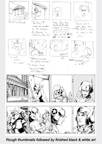 First, we feel silly ideas come faster late at night with a couple Cokes down the hatch. After that, we throw goofy ideas around until we can make a few stick with some greater story or character development that we know we'd like to see happen. Then we brainstorm as many funny things as we can come up with that all deal with that same idea. This part is usually handled in thumbnail form so we can get a better idea of space, timing of the jokes, and flow of the panels. From the thumbnails, final panels are penciled (with pencils), inked (a combination of brushes, pens, and sometimes crow quills), and scanned. To the right, you can see rough thumbnails for two strips, followed by the finished black and white art. After being scanned, the panels are lettered in Illustrator and InDesign to create the finished strips. For the complete pages, scans are colored digitally using a Wacom tablet and Photoshop on a Mac Pro. When colors are complete, the panels are arranged in InDesign, where lettering is done and final adjustments to the composition are made. Logos and complex balloons and shapes are made in Illustrator and brought into InDesign for the final layout. Voila!